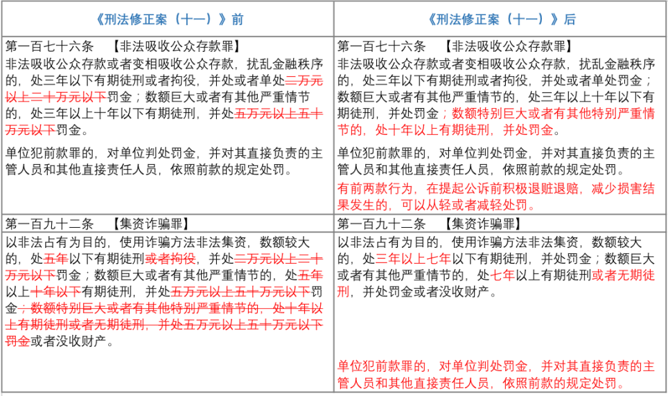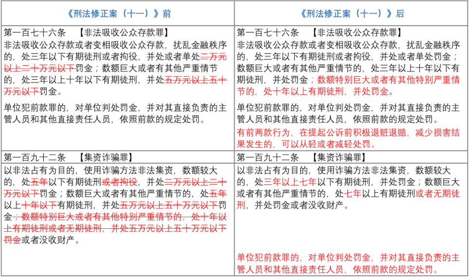 自2021年3月1日開始實施的《中華人民共和國刑法修正案(十一)》(以下簡稱“《刑修(十一)》),分別對非法吸收公眾存款罪與集資詐騙罪作出了重大修改,而為與《刑修(十一)》的修改相銜接,新《非法集資刑事案件解釋》亦作出了相對應(yīng)的修訂。