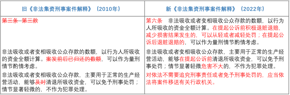 需要重點提示,《刑修(十一)》的上述規(guī)定,引起了新《非法集資刑事案件解釋》的相應(yīng)變化。具體體現(xiàn)于“將吸收的公眾存款主要用于正常生產(chǎn)經(jīng)營活動”這一情形中,可以以退贓退賠免予刑事處罰的最終時間點被明確了,由之前的“及時”修改為如今的“提起公訴前”。這一修改在事實上限縮了在上述情形中法院對被告人退贓退賠后免予刑事處罰的適用范圍,變相倒逼行為人在更早的階段中將贓款退賠。