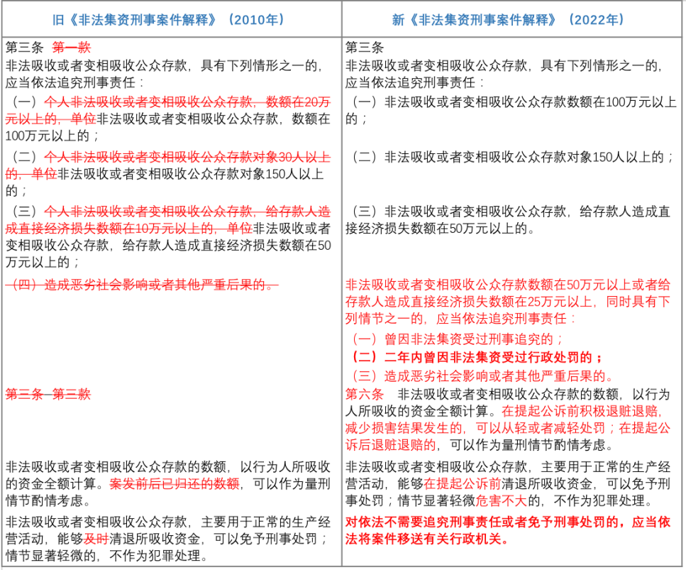 其中需要特別強(qiáng)調(diào)的在于,就非法吸收公眾存款罪的“立案標(biāo)準(zhǔn)”而言,新《非法集資刑事案件解釋》站在注重特殊預(yù)防的角度,針對行為人的再犯危險性進(jìn)行評價。故而在非吸數(shù)額或者非吸造成損失數(shù)額僅達(dá)入罪標(biāo)準(zhǔn)的一半的情況下,若行為人曾因非法集資受過刑事處罰或者2年內(nèi)因非法集資受過行政處罰的,也會被認(rèn)定構(gòu)成犯罪。