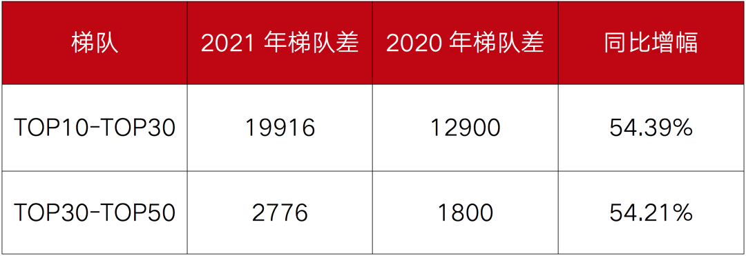 表:2021-2020年各梯隊(duì)企業(yè)在管門檻值梯隊(duì)差對(duì)比(萬平方米)