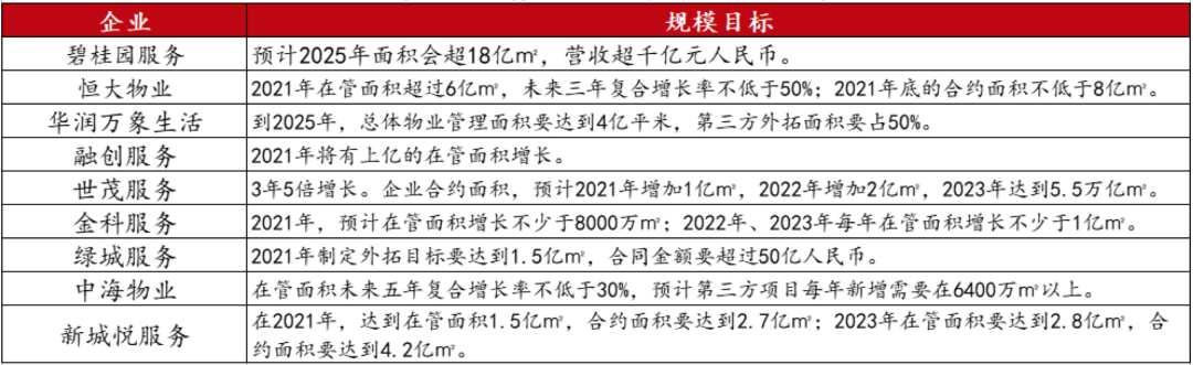 頭部企業(yè)更是定下高達(dá)數(shù)億的增長(zhǎng)目標(biāo),恒大物業(yè)2021年在管面積將破6億㎡,合約面積不低于8億㎡;綠城服務(wù)合約面積將新增1.5億㎡,碧桂園服務(wù)則表示2025年規(guī)模超18億㎡,營(yíng)收要超過千億元。世茂服務(wù)亦提出3年5倍計(jì)劃,2021年增加合約面積1億㎡,預(yù)計(jì)2023年合約面積達(dá)5.5億㎡。
