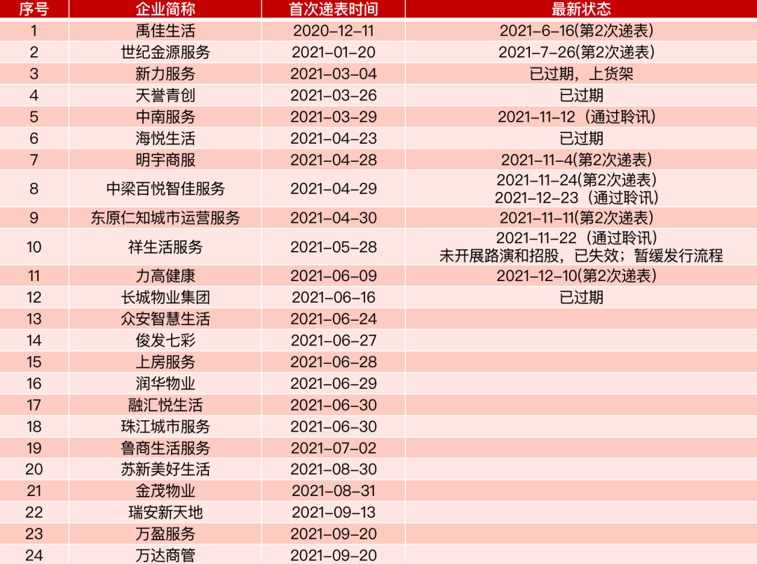 在市場(chǎng)的冰凍期,監(jiān)管層考慮、投資人離場(chǎng)心態(tài)、母公司急需資金紓困以及企業(yè)自身意愿的多重因素影響下,2021年下半年待上市物企被擺上貨架出售、推遲上市或者已經(jīng)通過聆訊也暫停上市。