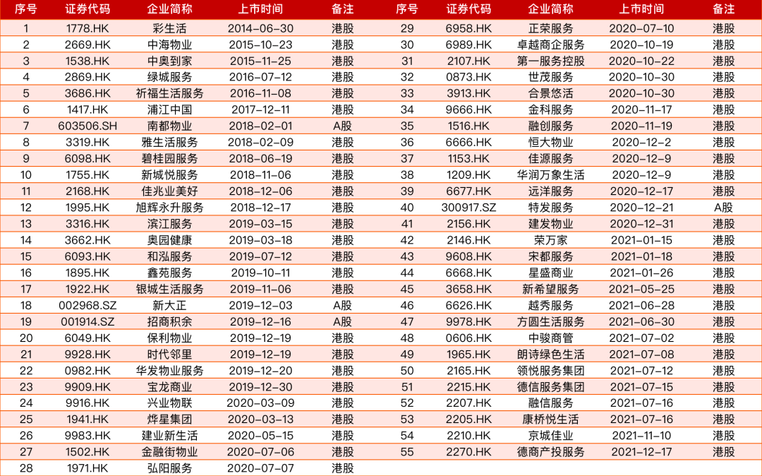 表:55家上市物企一覽表