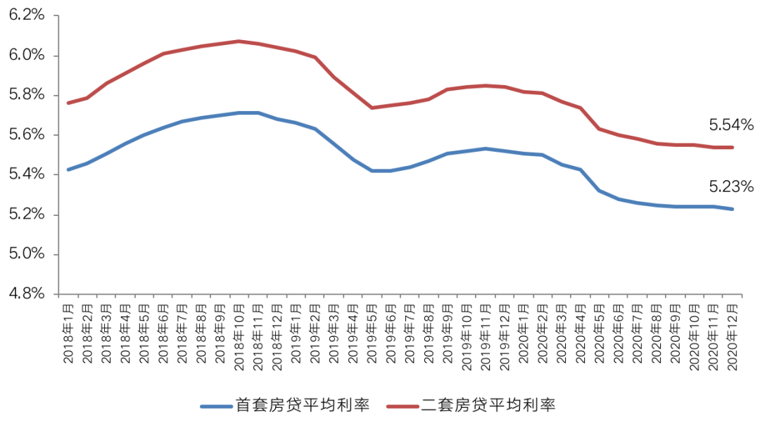 具體來看,上半年房地產(chǎn)信貸政策中性偏積極,央行三度降準(zhǔn)釋放長(zhǎng)期資金約1.75萬億元,并兩度下調(diào)LPR利率中樞,5年期以上LPR累計(jì)降幅達(dá)15個(gè)基點(diǎn)。受惠于信貸資金整體合理充裕,疊加LPR利率兩度下調(diào),房貸利率趨勢(shì)性下滑。融360數(shù)據(jù)顯示,截至2020年12月,全國(guó)首套房貸平均利率5.23%,較2019年12月減少29個(gè)基點(diǎn);二套房貸平均利率5.54%,較2019年12月減少30個(gè)基點(diǎn)。