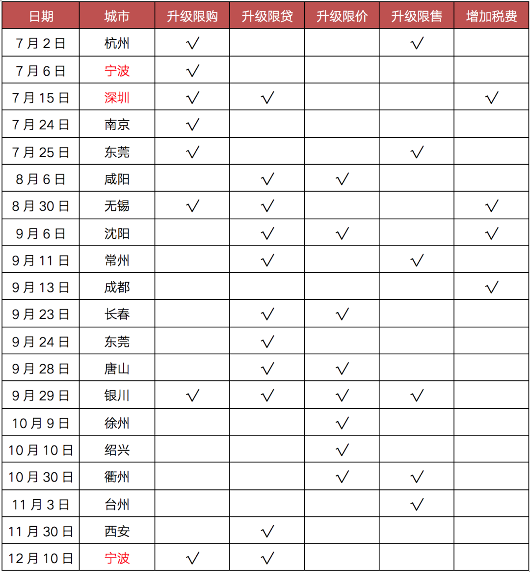 下半年伴隨著市場(chǎng)過熱,限價(jià)盤頻現(xiàn)“萬人搖”,土地市場(chǎng)高單價(jià)、高溢價(jià)地塊頻出、甚至“面粉貴過面包”的情況在部分二三線城市再次出現(xiàn),極大挑戰(zhàn)“穩(wěn)地價(jià)、穩(wěn)房?jī)r(jià)、穩(wěn)預(yù)期”的調(diào)控目標(biāo)。杭州、沈陽、西安和寧波等19城政策加碼,主要涉及升級(jí)限購(gòu)、升級(jí)限貸、升級(jí)限價(jià)、升級(jí)限售以及增加房地產(chǎn)交易稅費(fèi)等內(nèi)容,其中深圳政策力度最嚴(yán)苛,寧波更是兩度政策加碼。