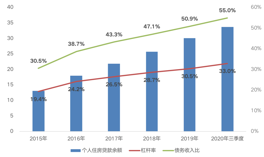 2016年以來,居民持續(xù)加杠桿購(gòu)房,致使杠桿率高企,償債能力大幅減弱。截至2020年三季度,個(gè)人住房貸款余額多達(dá)33.7萬億元,較2015年凈增長(zhǎng)157%,居民杠桿率逐年提升至33%,較2015年增加13.7個(gè)百分點(diǎn),債務(wù)收入比升至55%,較2015年增加24.5個(gè)百分點(diǎn)。