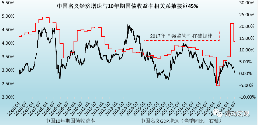 2、不過和美國一樣,中國的這種相關性同樣呈現出不穩定性的特征,2010年之后這種規律曾兩次被主觀因素打破,分別為2013年的“錢荒”和2017年的“強監管”,使得名義經濟增速在下行通道的過程中,10年期國債收益率仍然繼續大幅上行。其中,2013年10年期國債收益率甚至上行至4.55%附近,2017年也上行至4%左右。這使得2009年以來的經濟基本面與10年期國債收益率之間的相關系數降至40%附近。