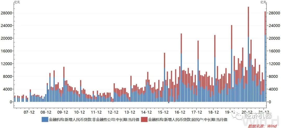 2)居民戶中長期新增貸款同比顯著少增,是拖累中長期新增貸款增加的主要原因。1月中長期貸款中,非金融公司中長期貸款新增2.1萬億元,同比基本持平。這與1月PMI數(shù)據(jù)相對一致,即生產(chǎn)活動維持相對平穩(wěn),不溫不火。