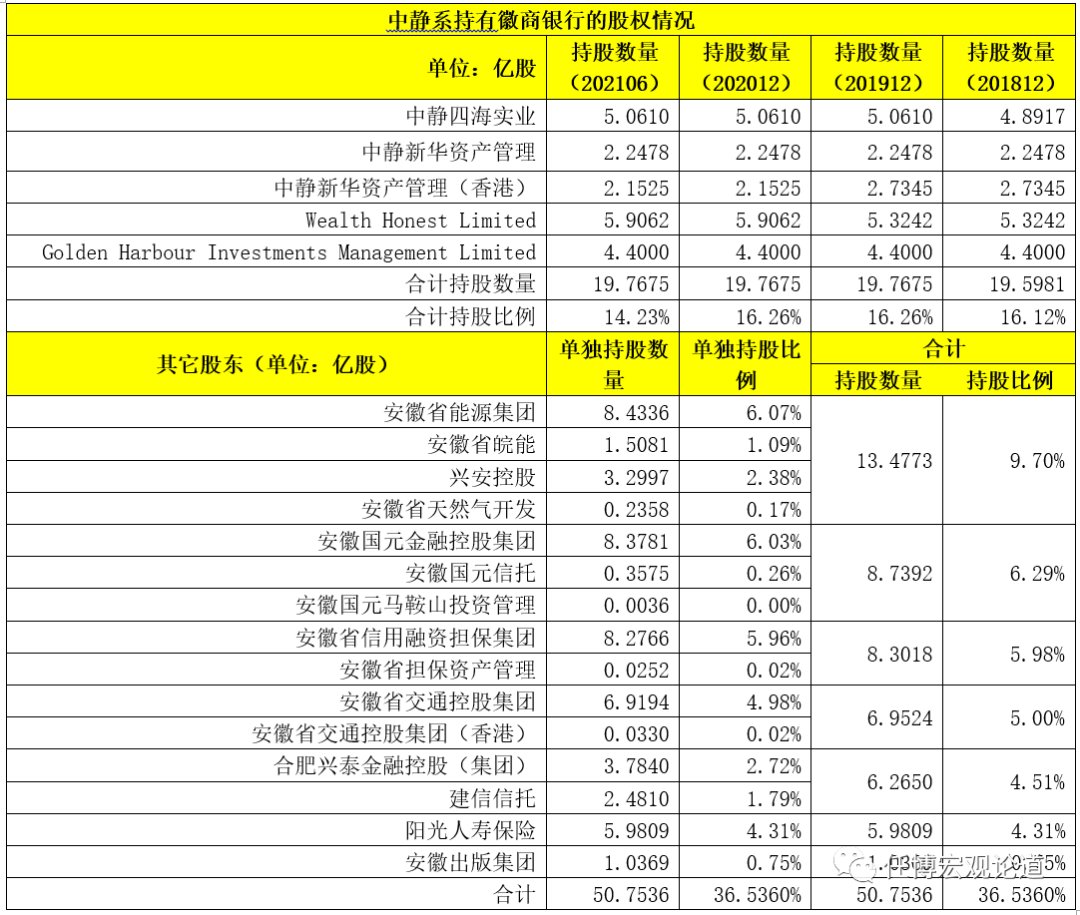 (2)中靜系主要通過旗下中靜新華資產管理、中靜新華資產管理(香港)、中靜四海實業以及Wealth Honest Limited、Golden Harbor Investments Management Limited等主體持有徽商銀行股份。截至2021年6月,中靜系合計持有徽商銀行19.7675億股股份,持股比例達到14.23%,為徽商銀行第一大股東。