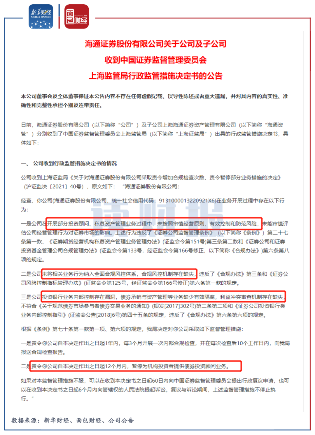 在資管業(yè)務(wù)方面,2021年3月,海通證券收到證監(jiān)會(huì)上海監(jiān)管局的行政監(jiān)管措施決定書,因?yàn)楹弦?guī)和風(fēng)控漏洞,監(jiān)管部門做出“12個(gè)月內(nèi),暫停為機(jī)構(gòu)投資者提供債券投資顧問業(yè)務(wù)”的處罰決定。