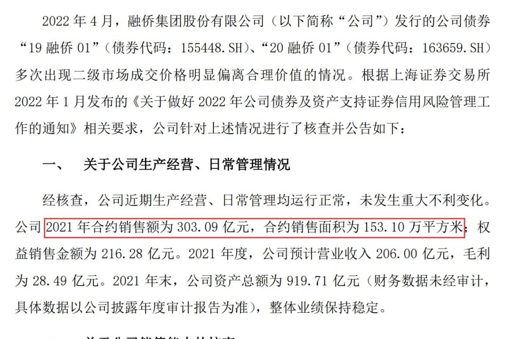 以最新數據為例,據融僑集團公告披露,2021年其合約銷售額為303.09億元,合約銷售面積為153.10萬平米;權益銷售金額216.28 億元。2021年預計營業收入206.00億元,毛利28.49億元。2021年末資產總額為919.71億元.