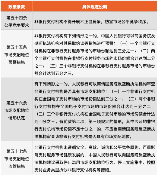 從《條例》具體條款來看,零壹智庫發(fā)現(xiàn),2個(gè)細(xì)則最能體現(xiàn)“強(qiáng)監(jiān)管”導(dǎo)向——第一項(xiàng)是第3章的支付業(yè)務(wù)規(guī)則,強(qiáng)化對(duì)于非銀行支付機(jī)構(gòu)的監(jiān)管,例如:將支付業(yè)務(wù)明確劃分為儲(chǔ)值賬戶運(yùn)營(yíng)和支付交易處理兩類,進(jìn)而適應(yīng)技術(shù)和業(yè)務(wù)創(chuàng)新的需要;第二項(xiàng)是第4章的監(jiān)督與管理,其中54-57這四個(gè)條款重點(diǎn)強(qiáng)調(diào)了非銀行支付機(jī)構(gòu)的反壟斷問題,明確指出“兩個(gè)非銀行支付機(jī)構(gòu)在非銀行支付服務(wù)市場(chǎng)的市場(chǎng)份額合計(jì)不可達(dá)到二分之一”,否則會(huì)觸發(fā)預(yù)警措施。