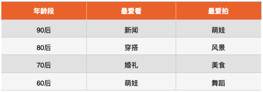 不難看出,21-25歲人群占據(jù)抖音用戶的主導(dǎo)位置,并且90后擁有穩(wěn)定工作、是支撐消費(fèi)市場(chǎng)的主力人群。從用戶偏好來看,不同年齡段的人群需求偏好存在一定差異性,譬如:女性偏愛潮流推薦和生活記錄;男性偏愛知識(shí)快訊;搞笑視頻和才藝視頻則受眾廣泛。