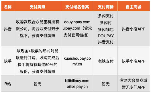 表 3:三大短視頻平臺(tái)支付領(lǐng)域進(jìn)程對(duì)比