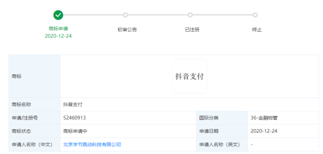 同時(shí),字節(jié)跳動(dòng)在2020年12月24日新增了“抖音支付”的商標(biāo)信息,國(guó)際分類為36-金融物管,商標(biāo)狀態(tài)為商標(biāo)申請(qǐng)中。此前,2019年7月25日,字節(jié)跳動(dòng)第一次申請(qǐng)36-金融物管類支付商標(biāo)但被駁回。