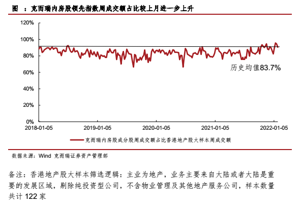 1月克而瑞內(nèi)房股領(lǐng)先指數(shù)成交額占香港地產(chǎn)股大樣本的成交額比值總體較上月進(jìn)一步上升,走勢(shì)向下。1月該指數(shù)成交額占比周均值92.5%,高于歷史均值83.7%,高于上月周均值87.4%,于月末同樣出現(xiàn)占比明顯下降的情況,使總體走勢(shì)向下。