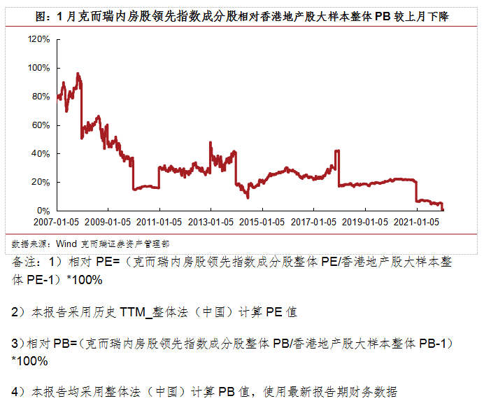 1月克而瑞內(nèi)房股領(lǐng)先指數(shù)成分股相對(duì)香港地產(chǎn)股大樣本整體PB較上月下降。1月該相對(duì)PB周均值為0.7%,低于上月相對(duì)PB周均值5.3%,低于2021年全年相對(duì)PB周均值6.2%。