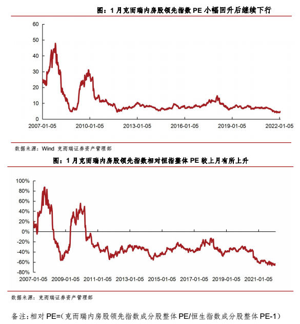 1月克而瑞領(lǐng)先股指上升6.9%,估值維持低位,成分股表現(xiàn)較好。