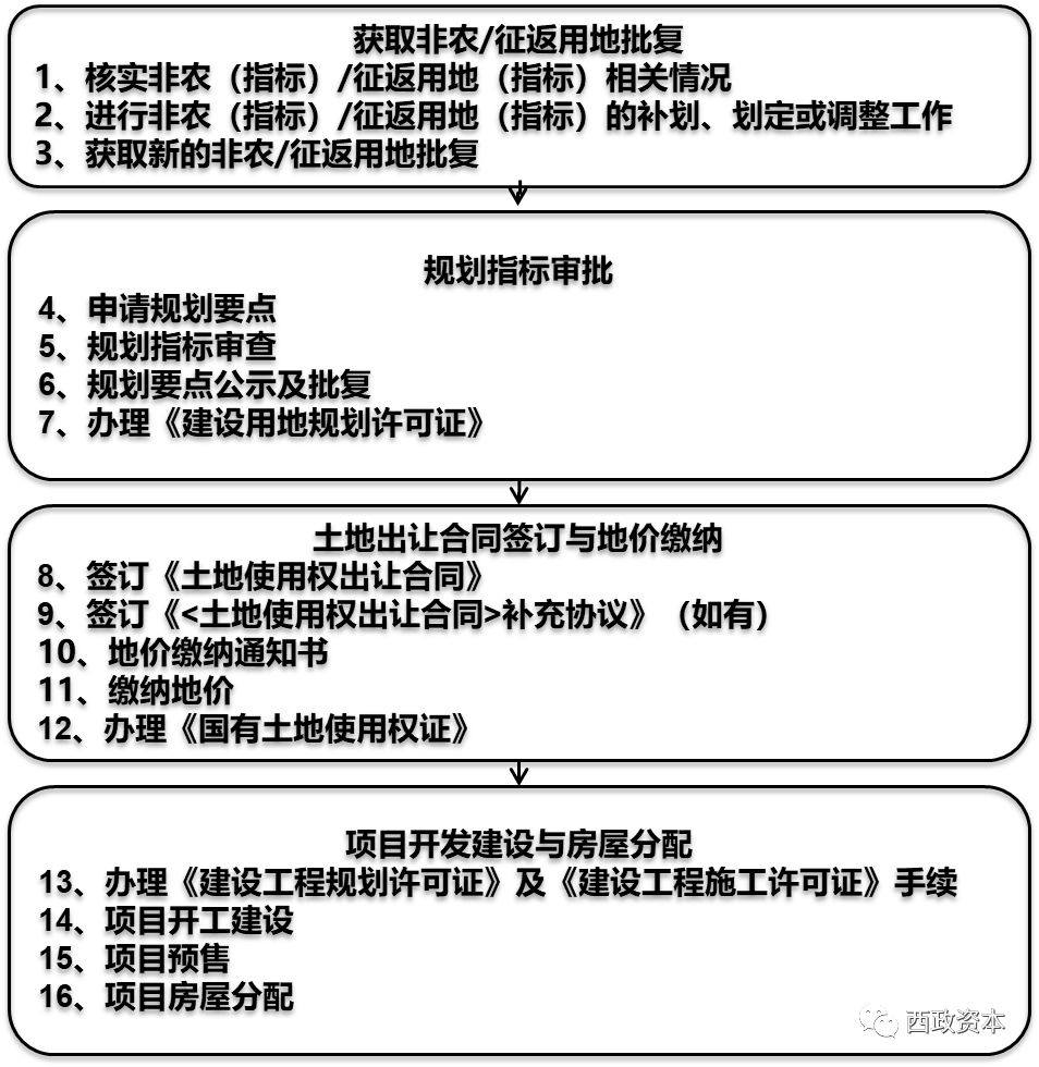 非農(nóng)建設(shè)用地/征地返還用地項(xiàng)目的具體操作流程上,一般均需經(jīng)歷如下流程: