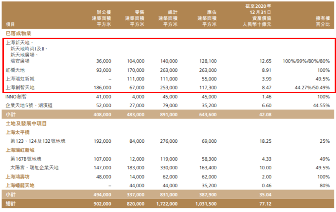 另據(jù)2020年瑞安房地產(chǎn)年報(bào)顯示:“本集團(tuán)目前於上海持有及管理作零售及辦公樓用途的總建築面積達(dá)172萬平方米(「上海物業(yè)組合」)。截至2020年12月31日,上海商業(yè)物業(yè)組合的資產(chǎn)價(jià)值總額約為人民幣770億元。”