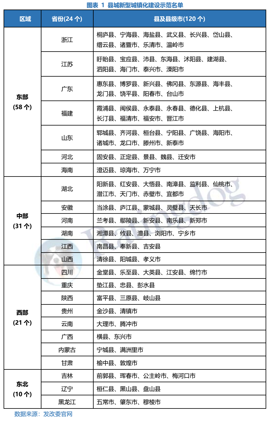東部經濟發達地區縣城入選數量多于西部、東北經濟欠發達地區。120個示范縣中,東部省份占據58個,數量將近一半,其中經濟較為發達的省份浙江、江蘇、廣東、福建、山東均為10個;中部次之,共有31個縣城入選示范縣,其中湖北為10個,遠多于其他中部省份,可能發改委考慮到湖北在中部省份中經濟較為發達,且2020年受到疫情影響較為嚴重,給與一定的政策支持;西部和東北經濟較為落后,入選縣城數量較中、東部有所減少。