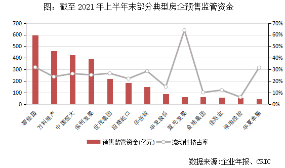 房企層面,由于城市政策效應存在抵消,預售監管資金的釋放也將有限。但統一規定后,預售監管資金占預收賬款或合同負債比重高的房企或能獲得比較多的流動性,這類房企可能由于城市布局或企業經營原因,受監管整體趨嚴。從部分房企2021年上半年末披露的預售監管資金來看,占到預收賬款或合同負債的4%-20%。