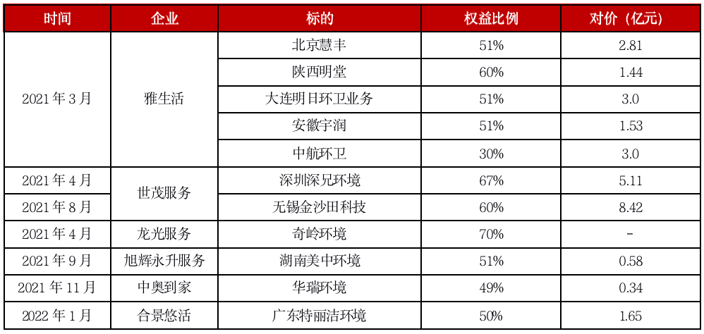 第三類,通過收購環(huán)衛(wèi)企業(yè)布局環(huán)衛(wèi)市場。據(jù)克而瑞物管不完全統(tǒng)計,2021年物企收并購共155起,其中11起以環(huán)衛(wèi)為標的,占比約7.1%。