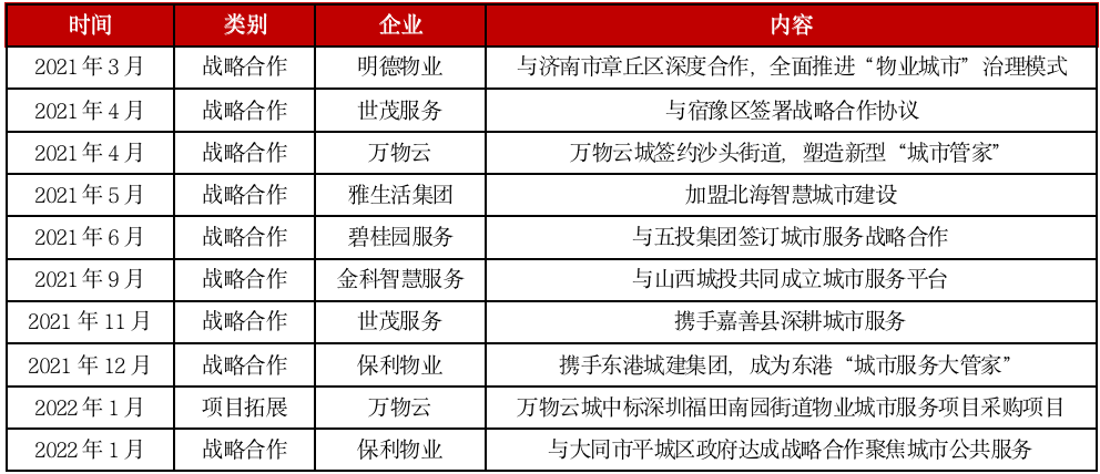 無論是通過招投標獲取單個項目,還是承接項目總包,政企資源均發(fā)揮了重要作用,2021年以來物企通過與地方政府、城投公司或戰(zhàn)略合作,或成立合資公司等方式,共同推進城市服務的落地。