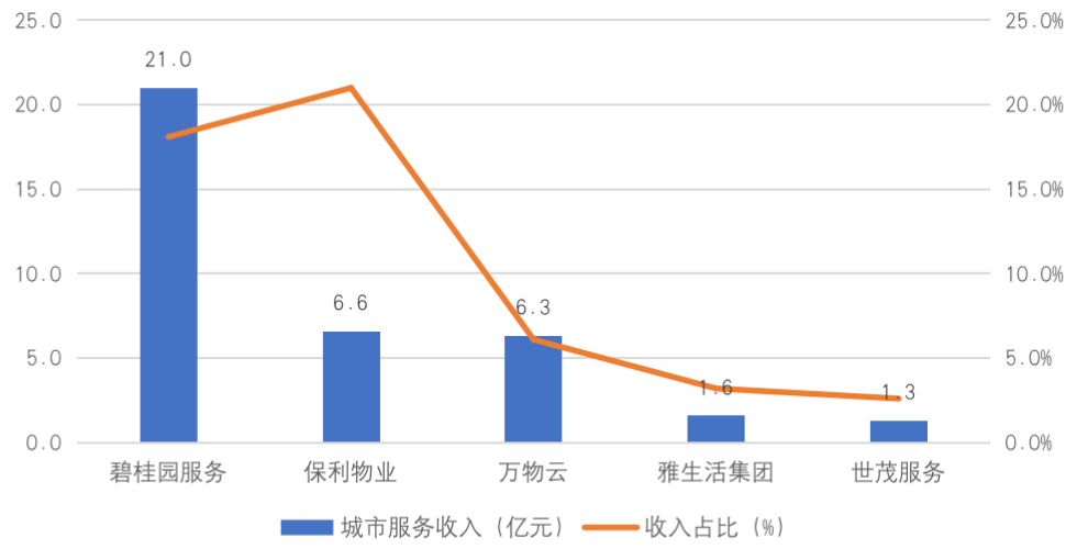 “城市服務”已然成為了物企業(yè)爭相布局的藍海賽道,但從企業(yè)經(jīng)營數(shù)據(jù)來看,該業(yè)務仍處于起步階段。截至2021年6月30日,碧桂園服務的城市服務營收最高,達到21.0億元,其余企業(yè)均不超過10億元。在城市服務收入占總收入的比例上,除了碧桂園服務和保利物業(yè)外,企業(yè)該業(yè)務的收入占比均不超過10%。