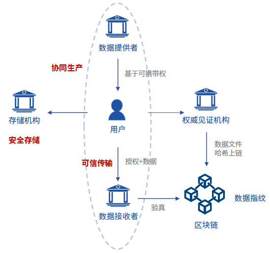 第一步是用戶從數(shù)據(jù)提供者處下載個(gè)人信息數(shù)據(jù),并存儲(chǔ)在個(gè)人指定的位置。存儲(chǔ)位置可以是本地,也可以是云或其它位置。為了確保個(gè)人真實(shí)意愿、防止真實(shí)數(shù)據(jù)被篡改、保持傳輸給接收者的個(gè)人信息與提供者提供的個(gè)人信息一致,經(jīng)用戶授權(quán)后,可進(jìn)一步引入權(quán)威中立的第三方機(jī)構(gòu)參與見證該個(gè)人數(shù)據(jù)文件的傳輸過程,并獲取相關(guān)文件的哈希值(而非源文件)作為“數(shù)據(jù)指紋”存儲(chǔ)于區(qū)塊鏈上。第二步是用戶將已下載的個(gè)人信息數(shù)據(jù)傳輸給數(shù)據(jù)接收者,并對(duì)使用范圍和使用目的等進(jìn)行授權(quán)。數(shù)據(jù)接收者在收到個(gè)人信息數(shù)據(jù)文件之后,可以將該文件與此前存儲(chǔ)于區(qū)塊鏈上的“數(shù)字指紋”進(jìn)行比對(duì),從而完成驗(yàn)真的過程。與此同時(shí),個(gè)人的所有授權(quán)記錄、數(shù)據(jù)接收者的具體使用情況也皆可在鏈上進(jìn)行記錄,便于個(gè)人未來追溯相關(guān)文件的流轉(zhuǎn)。