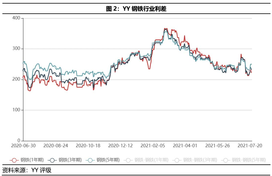 鋼鐵行業(yè)的利差自2020年11月以來(lái)一路走高,直到2021年2月末才逐漸緩和,截至2021年6月末,鋼鐵行業(yè)利差保持在240BP左右的水平。