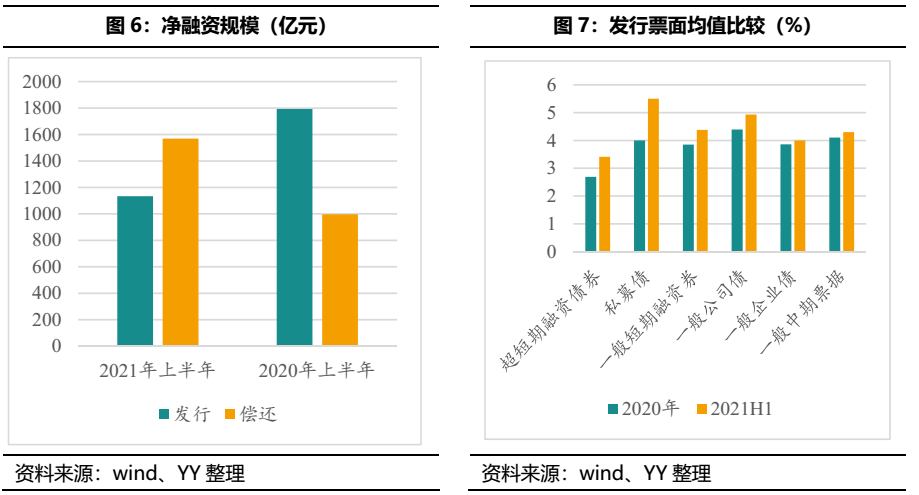 從凈融資規(guī)模來(lái)看,2021年上半年凈融資-434.85億元,而2020年上半年行業(yè)整體凈融資795.68億元,融資收縮明顯。從發(fā)行票面來(lái)看,2021年上半年各券種的發(fā)行票面均值相比去年有一定增加,融資成本提高。