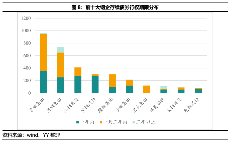 從前十大鋼企存續(xù)債的行權(quán)分布來(lái)看,首鋼集團(tuán)、山鋼集團(tuán)、寶鋼股份在一年內(nèi)面臨的行權(quán)壓力最大,均超過(guò)了260億元;其次為河鋼集團(tuán),有252億元;整體來(lái)看,這些鋼企的債券都集中三年內(nèi)到期。