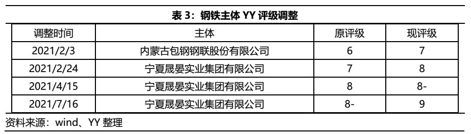 回溯上半年鋼企的外部評(píng)級(jí)調(diào)整,只有寧夏晟晏(已有債券展期)外部評(píng)級(jí)遭到了多次評(píng)級(jí)機(jī)構(gòu)的下調(diào),而YY評(píng)級(jí)基于基本面分別對(duì)包鋼股份、寧夏晟晏進(jìn)行了評(píng)級(jí)下調(diào)。