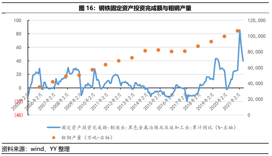 供給端來(lái)看,鋼鐵產(chǎn)能具有易上難下的特征。具體數(shù)據(jù)來(lái)看,一方面,鋼鐵固定資產(chǎn)投資完成額持續(xù)保持增長(zhǎng),另外由于政策對(duì)鋼鐵產(chǎn)能新建的限制,鋼鐵產(chǎn)能擴(kuò)張主要以技改和產(chǎn)能置換的方式進(jìn)行,據(jù)不完全統(tǒng)計(jì),在2020-2025年之間仍有近1.5億噸的新增煉鋼產(chǎn)能,預(yù)計(jì)未來(lái)供給端仍有一定抬升。