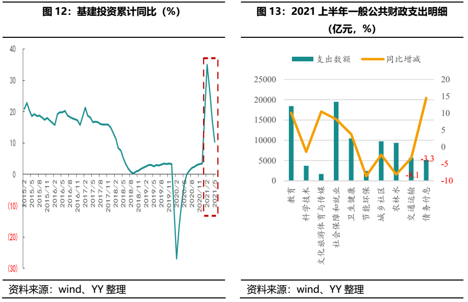 另外,一般公共財(cái)政支出對(duì)于基建的支持力度也在趨緩,就2021年上半年財(cái)政收支情況來(lái)看,與基建相關(guān)的城鄉(xiāng)社區(qū)、農(nóng)林水事務(wù)、交通運(yùn)輸、節(jié)能環(huán)保支出同比下降2.3%、8.1%、3.3%、8.6%,顯示財(cái)政支出對(duì)于基建的支撐力度不足。
