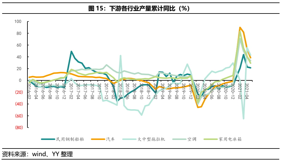 制造業(yè)用鋼來(lái)看,2021年年初以來(lái),主要工業(yè)品產(chǎn)量累計(jì)同比增速逐漸下滑,尤其是汽車、船舶、家電等累計(jì)增速轉(zhuǎn)弱。