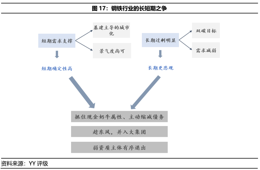 因此站在這種長(zhǎng)短期博弈的角度來(lái)看,鋼企最好的方向有三條,第一,抓住鋼鐵業(yè)務(wù)現(xiàn)金奶牛的屬性,收割現(xiàn)金流,在盈利的時(shí)候主動(dòng)降杠桿;第二,趁行業(yè)整合的東風(fēng),并入大集團(tuán),利用邊際改善自身現(xiàn)狀;第三,經(jīng)濟(jì)結(jié)構(gòu)決定經(jīng)濟(jì)供給,一些弱資質(zhì)主體在償還完債務(wù)后有序退出資本市場(chǎng)。