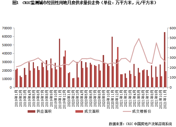 供應方面。一方面由于11月重點城市迎來集中供地潮,有多達15個重點城市掛牌了第三批集中出讓地塊;另一方面,由于臨近年底,非重點城市也迎來集中供地潮,因此11月份土地市場供應量達到年內最高水平。據CRIC統計數據顯示,全國土地市場經營性土地供應總建筑面積65179萬平方米,環比大漲141%,同比也上漲了9%。