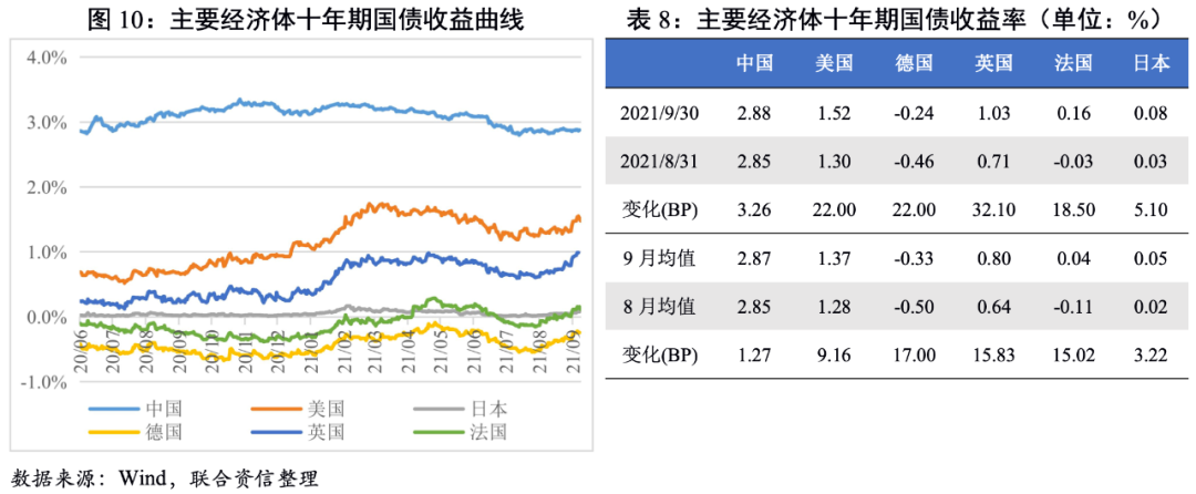 ?國別利差:9月美國、德國、英國、法國、日本十年期國債收益率均值全面上行,我國與上述經濟體十年期國債利差均值普遍收窄。
