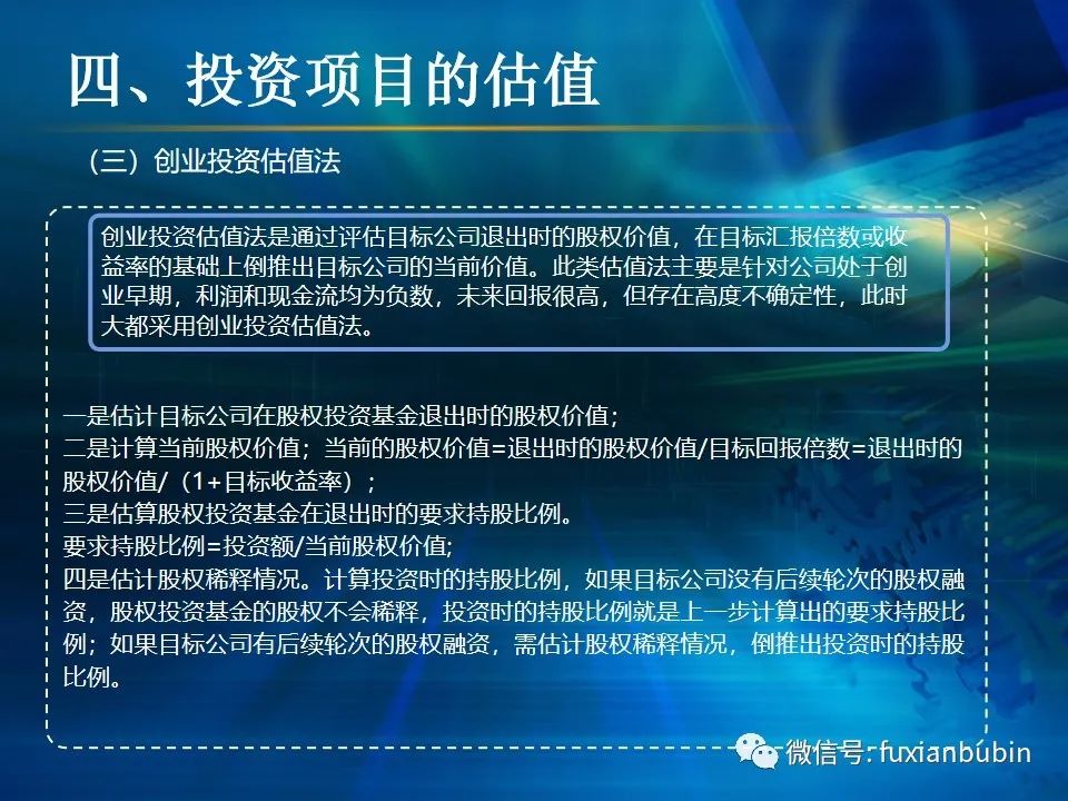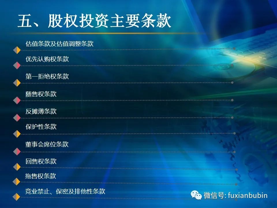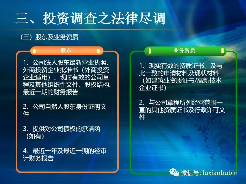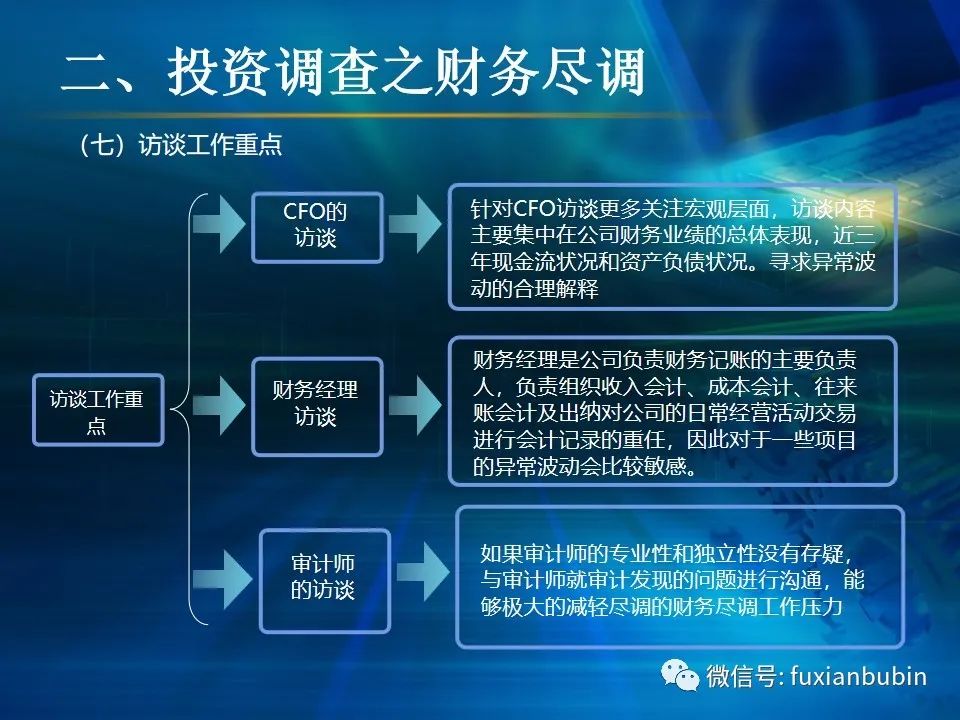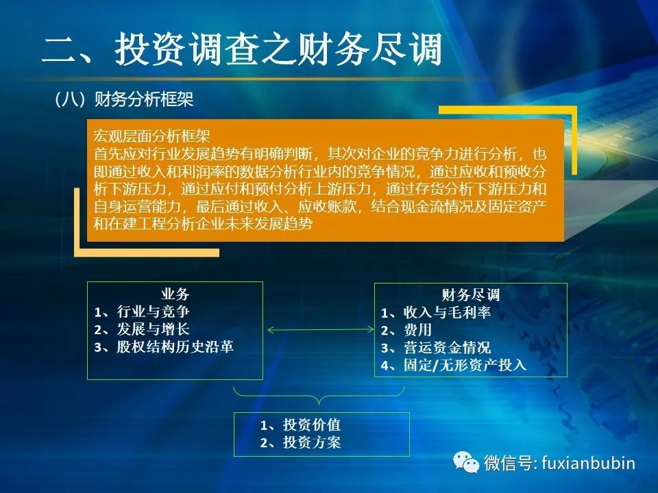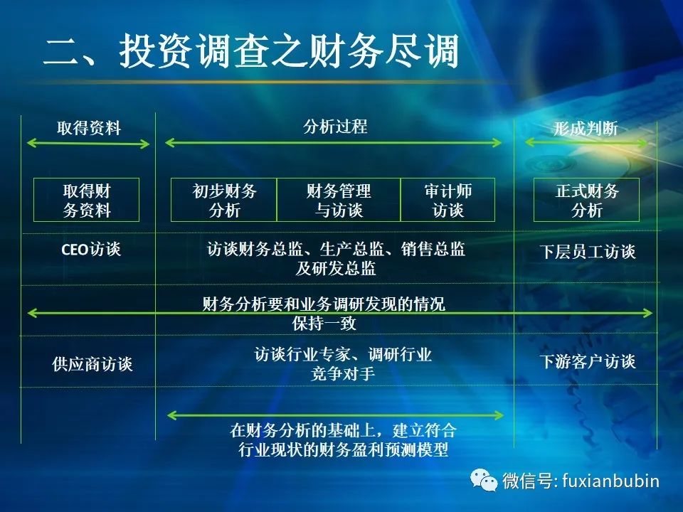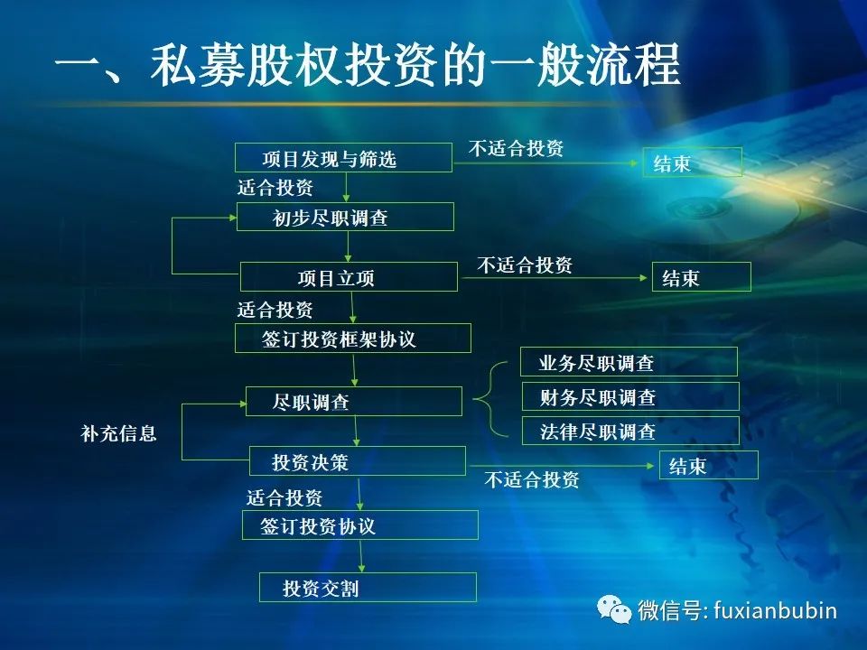 私募股權(quán)投資基金的投資工作,其業(yè)務(wù)流程主要圍繞投資決策開展,通常包括項(xiàng)目開發(fā)與篩選,初步盡職調(diào)查,項(xiàng)目立項(xiàng)、簽訂框架投資協(xié)議、盡職調(diào)查、投資決策、簽署投資協(xié)議、投資交割等主要環(huán)節(jié)。在這一過程中,財(cái)務(wù)盡調(diào)主要關(guān)注目標(biāo)公司的歷史財(cái)務(wù)業(yè)績的情況,并對未來財(cái)務(wù)狀況進(jìn)行合理預(yù)測。調(diào)查內(nèi)容包括企業(yè)的歷史經(jīng)營業(yè)績,未來盈利預(yù)測、營運(yùn)資金、融資結(jié)構(gòu)、資本性開支以及財(cái)務(wù)風(fēng)險(xiǎn)敏感度分析等。其作用在于為投資及整合方案設(shè)計(jì)、交易談判、投資決策提供支撐,進(jìn)而判斷投資是否符合戰(zhàn)略目標(biāo)及投資原則。法律盡職調(diào)查是對相關(guān)法律事務(wù)具有法律意義的背景資料進(jìn)行應(yīng)有的調(diào)查,使相關(guān)法律事務(wù)的處理建立在客觀、全面的信息基礎(chǔ)之上,以確保相關(guān)法律事務(wù)的處理能夠達(dá)到預(yù)期的結(jié)果,而不因相關(guān)信息在真實(shí)性、完整性、全面性、合法性等方面的原因影響預(yù)期目標(biāo)的實(shí)現(xiàn)。經(jīng)過財(cái)務(wù)盡調(diào)與法律盡調(diào),在股權(quán)投資之前,需要考慮該項(xiàng)投資的性質(zhì)、事實(shí)和背景,為之選擇恰當(dāng)?shù)墓乐捣椒ǎ⒔Y(jié)合市場參與者的假設(shè),采用合理的市場數(shù)據(jù)和參數(shù)對目標(biāo)公司進(jìn)行估值,明確目標(biāo)公司的公允價(jià)值。