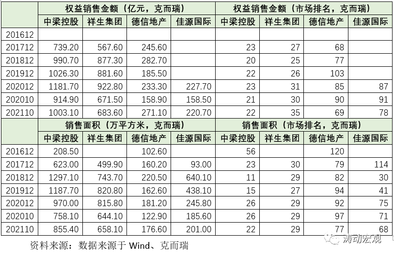 1、以今年1-10月權益銷售數據為例,排名從高到低依次為中梁控股(位列地產行業22強)、祥生集團(位列地產行業35強)、德信地產(位列地產行業69強)以及佳源國際(位列地產行業78強)。