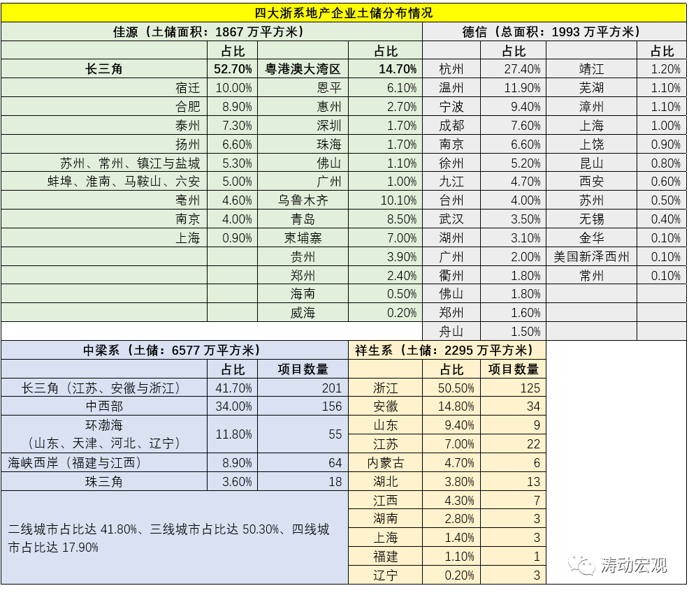 從土儲分布情況來看,這四家在上海本地的拿地比例均不高,其它方面也有一些自己的特色,如德信比較集中,中梁系主要在二三線城市、祥生系聚焦于浙江與安徽兩大地區,佳源則相對較為分散。