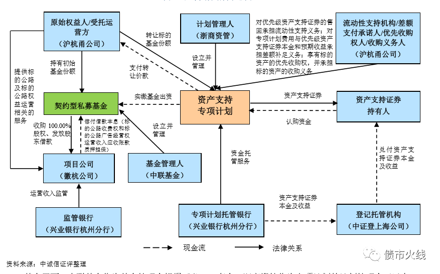 這個交易結構是非常典型的類reits項目交易結構。項目公司徽杭公司由原始權益人滬杭甬公司100%控股,滬杭甬公司擁有AAA的強主體評級。項目公司在2019年6月4日減少注冊資本以前,注冊資本為19.50億元。截至2019年3月末,項目公司總資產18.91億元,總負債0.37億元,可以說基本就是股東注資=高速公路及附屬設施建設形成資產的財務結構。