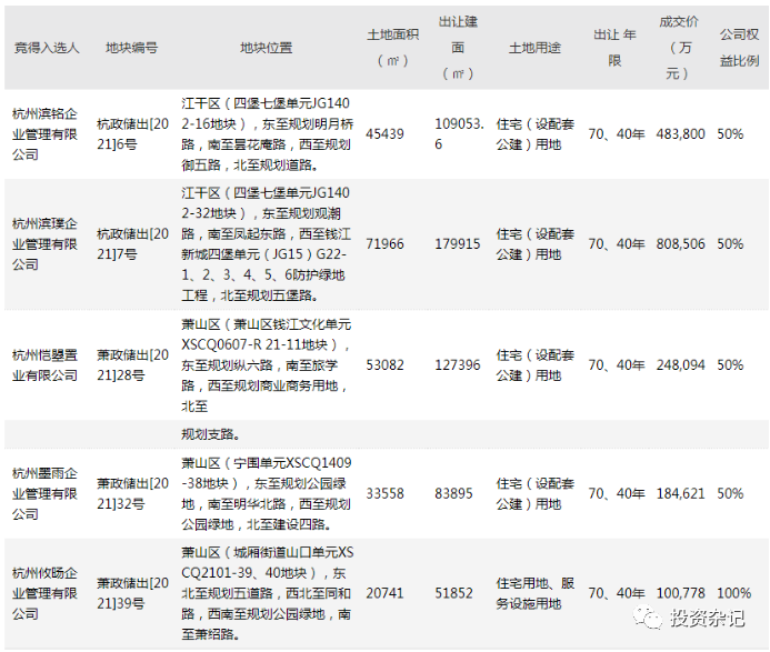 杭州五月份兩天土拍一共是吸金1178.2億元,地方政府無(wú)疑是最大的贏家,賺的盆滿缽滿。這次土拍最亮眼的是杭州王濱江集團(tuán)和深耕杭州多年的融信,倆家一起合作拿了4快遞,總價(jià)172.5億元,融信自己拿了3塊地,總價(jià)56.02億,濱江自己拿了一塊地,總價(jià)10.07億。下面是濱江拿地的情況。