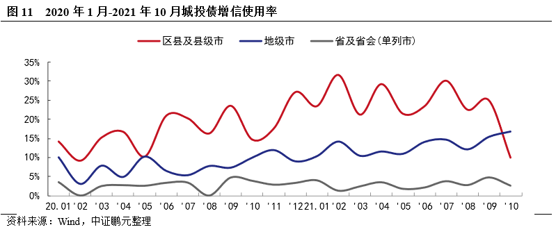 2021年10月份,城投債總體增信使用率為11.0%,較上月下降5.13個百分點。從行政級別上來看,區(qū)縣級平臺、地級市平臺和省級平臺的增信使用率分別為10.0%、16.8%、2.6%,較上月分別下降14.9個百分點、上升1.4個百分點和下降2.2個百分點。因區(qū)縣級平臺發(fā)行難度上升,該級發(fā)債主體的大幅下使增信使用率也隨之下降,而地級市平臺的增信使用率仍保持上升趨勢,市場對城投的風(fēng)險偏好降低。