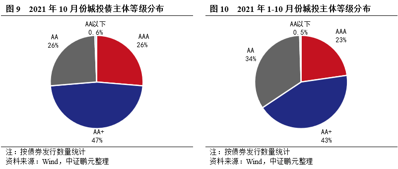 2021年10月份,城投債發(fā)行人AA+級以上級別合計占比達到73.7%,較上月上升11.0個百分點。具體看,AAA主體發(fā)債85 只,占比26%,較上月上升6.7個百分點;AA+主體發(fā)債153 只,占比47%,較上月上升4.3個百分點;AA主體發(fā)債83 只,占比26%,較上月下降11.1個百分點;10月份,仍有2只AA-級主體發(fā)行債券,占比0.6%。綜合1-10月的發(fā)行情況,AA+級別以上主體的合計占比65.7%,較1-9月上升0.5個百分點。