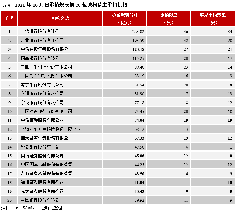 2021年10月份,共有90家機構(gòu)參與了城投債的承銷工作,其中券商56家,銀行機構(gòu)34家。就承銷規(guī)模而言,中信銀行以223.82 億元的承銷規(guī)模位居第一,位居首位;興業(yè)銀行以193.59億元的承銷規(guī)模位居第二,中信證券、招商銀行、民生銀行的承銷規(guī)模分別位于第三至五位。就券商機構(gòu)而言,券商機構(gòu)合計承銷918.03億元,占總發(fā)行額的38%,以中信建投、中信證券、國泰君安的承銷規(guī)模較大,分別位于第3、11、13位。