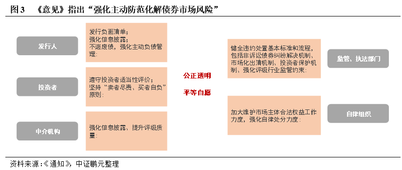 隨著我國債券市場的發展,完善投資者保護及市場風險化解迫在眉睫。《意見》在前期政策的基礎上,將制度整合,構建出較為清晰的頂層設計,對債券發行、存續期、違約后進行全周期管理,覆蓋發行人、中介機構、自律組織、監管和執法機關等參與主體。《意見》強調,要把主動防范化解債券市場風險放在更加重要的位置,筑牢市場準入、早期干預和處置退出三道防線,健全風險監測預警機制。維護債券違約處置過程公正透明、平等自愿,充分保障投資者合法權益。本文認為,主動風險管理制度包括各參與方的日常風險識別和跟蹤制度、債務管理工具(包括現金要約收購、債券置換等)、風險處置制度等。隨著覆蓋債券存續期的風險管理制度的完善,將為風險定價奠定基礎。