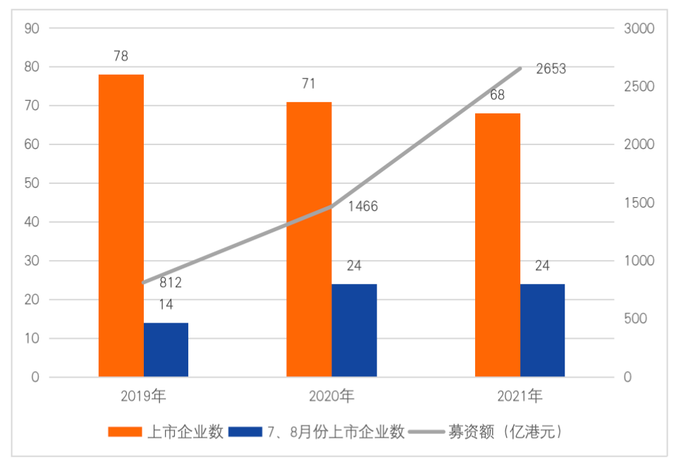 從上市時間上看,具有一定的周期性,2021年第一季度和第三季度赴港上市企業相對較多,在7月份多重因素驅動下,達到了20個中國企業上市數量。